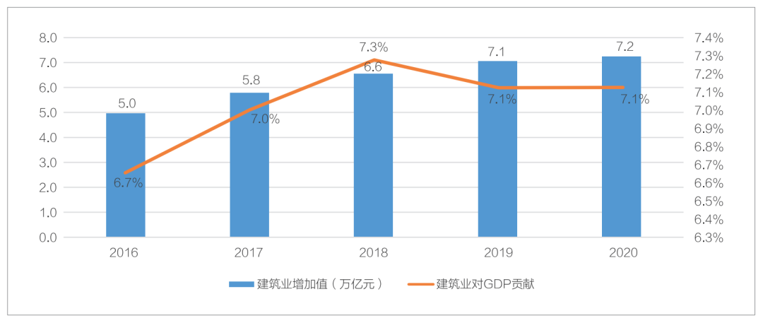 建筑業是我國國民經濟的支柱產業。2020年,我國建筑業實現總產值26.4萬億元。“十三五”期間,建筑業總產值年均增長7.8%。相對于“十二五”期間建筑業總產值13.5%的年均增速,“十三五”期間建筑業增長放緩。