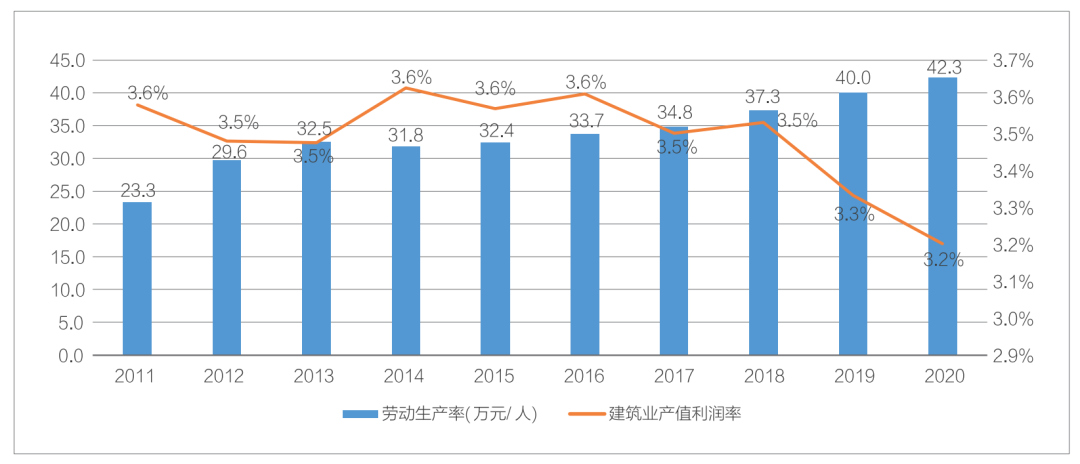 雖然建筑業總量在不斷增長,但發展方式粗放。從產值利潤率來看,伴隨著建筑業總產值的屢創新高,產值利潤率不斷下降,2020年產值利潤率為3.2%,低于2011年的3.6%。從勞動生產率來看,雖然有所增長,但年均增速均小于同期建筑業總產值增速,發展質量和效益不高。“十二五”期間,建筑業勞動生產率年均增長9.7%;“十三五”期間,建筑業勞動生產率年均增長5.5%。